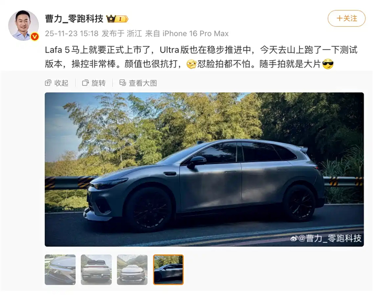 日前,零跑科技高级副总裁曹力在社交媒体上晒出了Lafa5 Ultra版的实车图,该车型预计将会是Lafa5的性能版本。据悉,Lafa5将于11月28日上市,而Lafa5 Ultra版将会在2026年第二季度上市。
